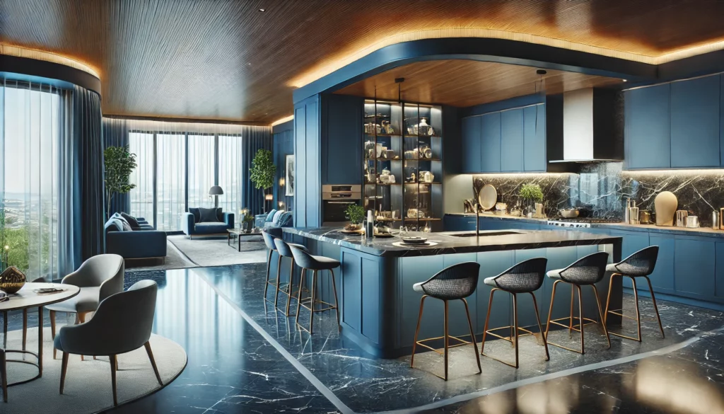 Les bleus profonds, tels que le bleu marine, le bleu cobalt ou le bleu nuit, apportent une touche d’élégance et de raffinement à la cuisine. Ces teintes sont parfaites pour ceux qui souhaitent créer un espace sophistiqué et intemporel. Associés à des matériaux comme l’acier inoxydable ou le cuivre, ces bleus peuvent également accentuer les éléments métalliques, ajoutant une dimension luxueuse à la pièce.